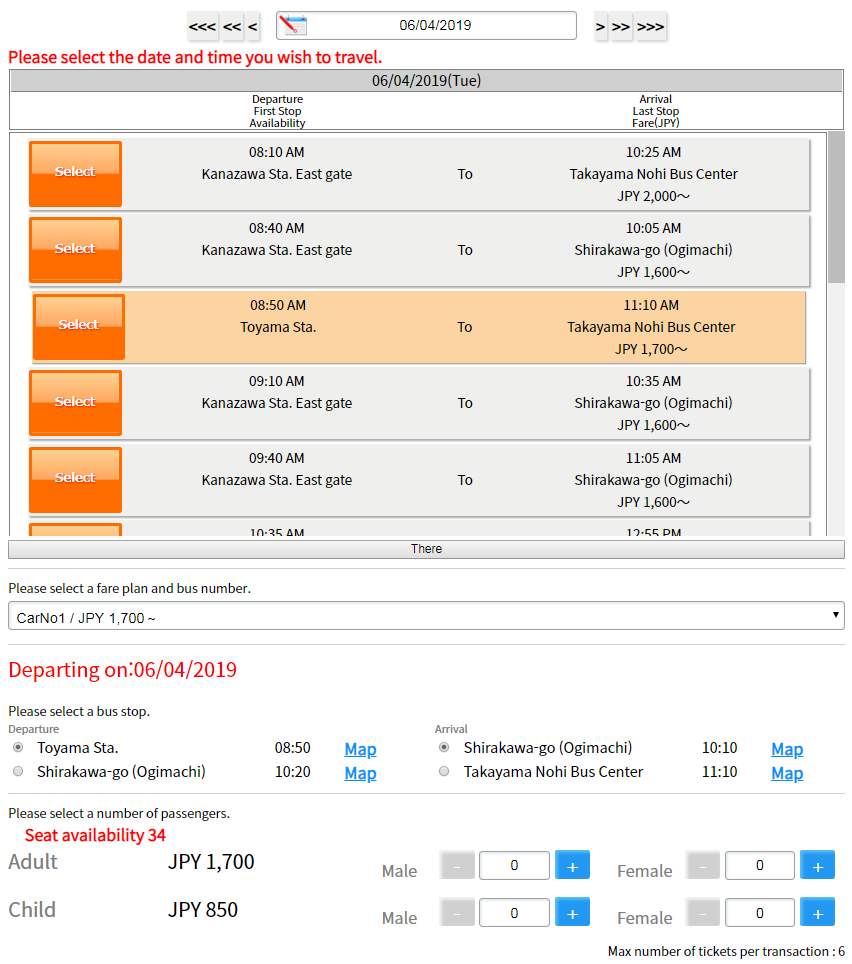 여기서 Departure는 Toyama Sta. 선택, Arrival은 Shirakawa-go를 선택하면 성인 1인당 1700엔의 가격이 나온다.