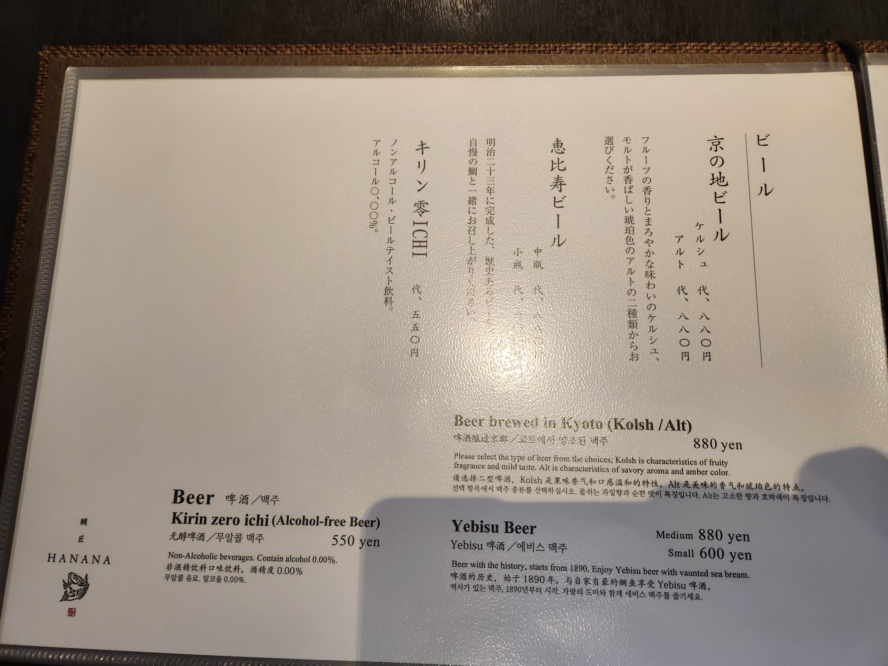 가격은 2750엔이고 맥주는 교토맥주 병맥주가 있고 콜쉬 알트가있는데 콜쉬로 주문했다.