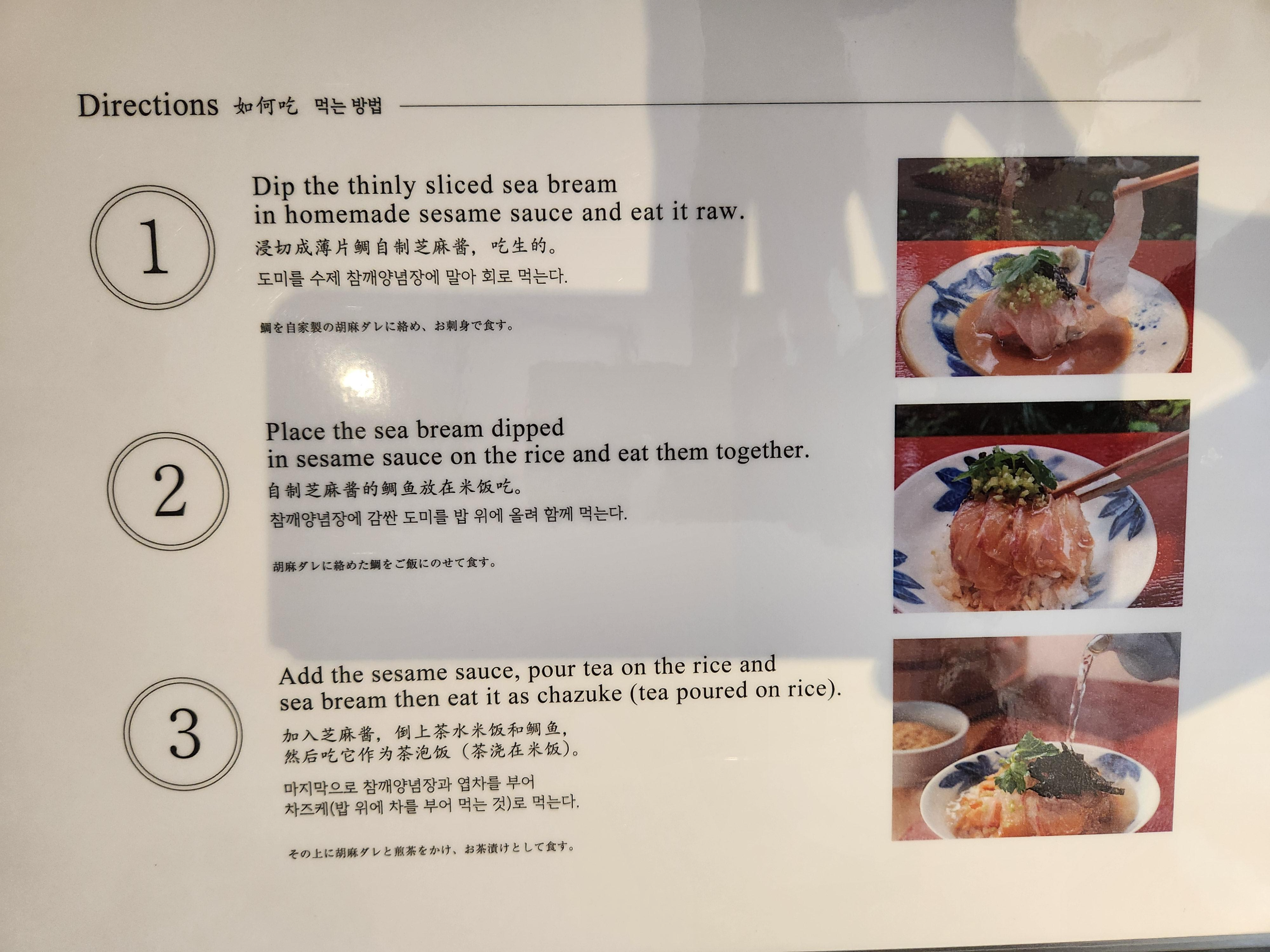 타이차즈케(도미차즈케) 를 먹는 방법도 알려주는데 순서대로 세 가지 맛을 즐기면 된다.