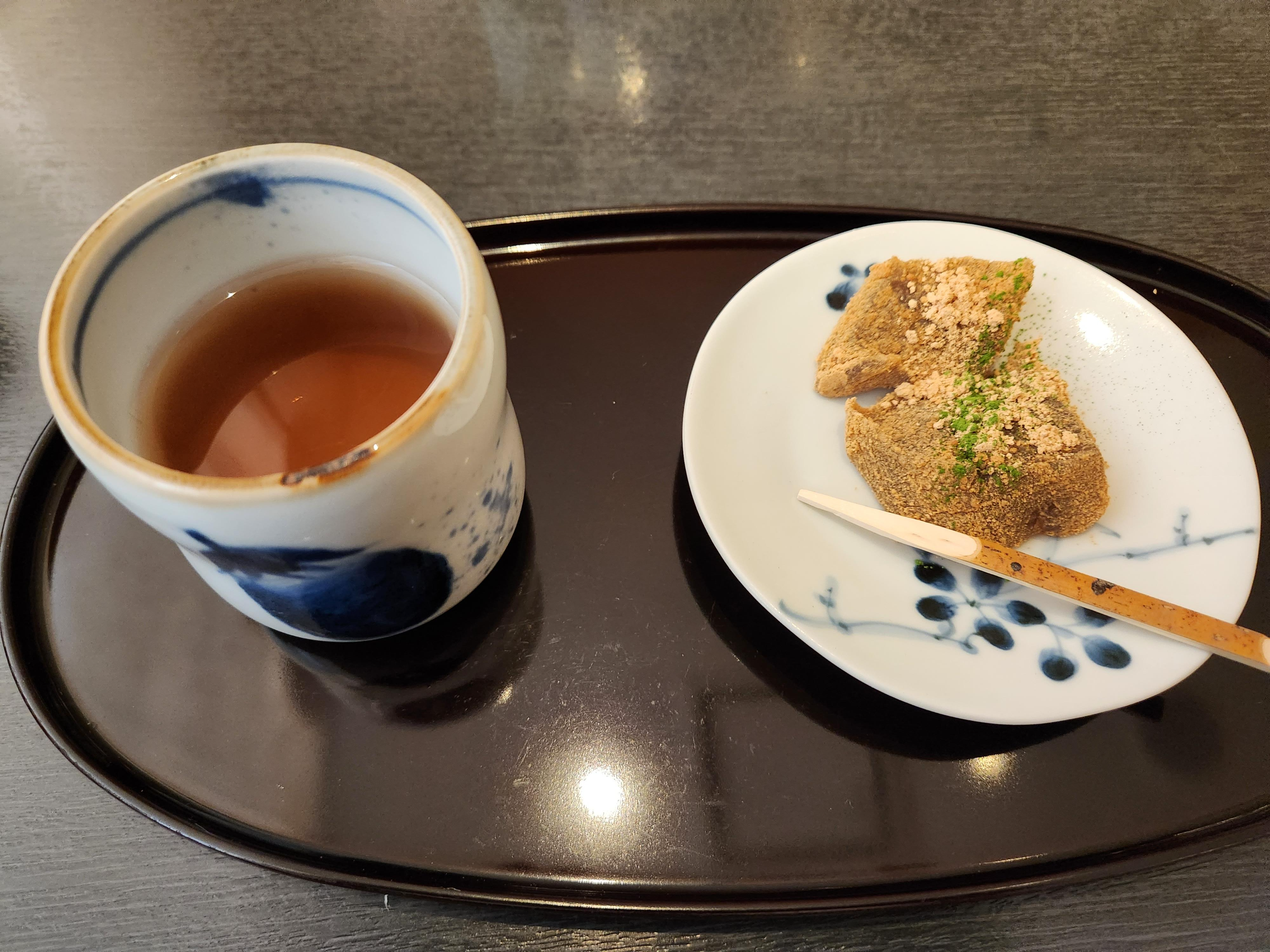후식으로는 콩차와 교토식 떡을 주는데 콩차는 구수 고소하고 떡은 콧물질감인데 달달해서 맛있다.