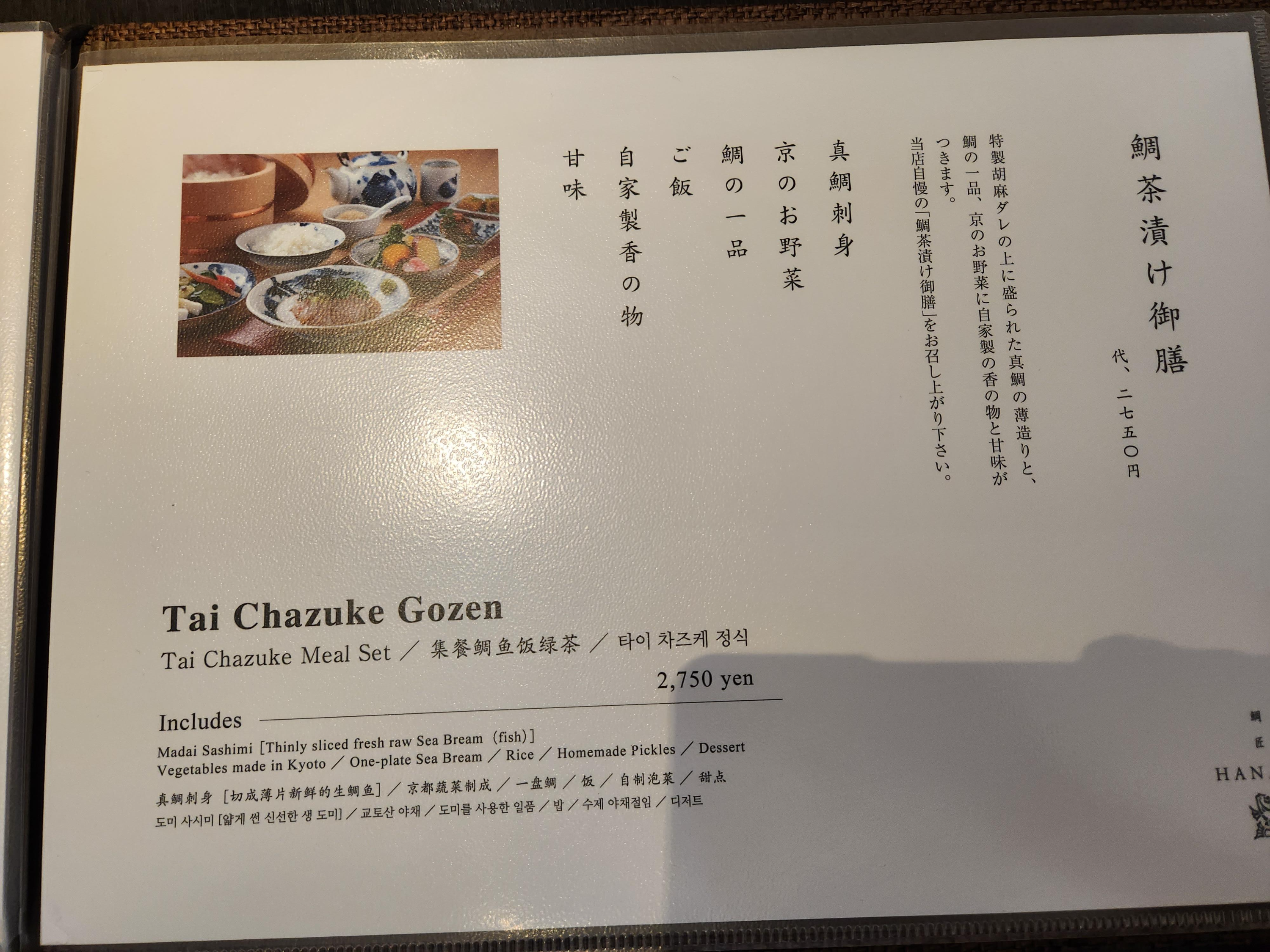 교토 아라시야마 하나나는 타이차즈케를 먹을 수 있는 도미 전문점이다.