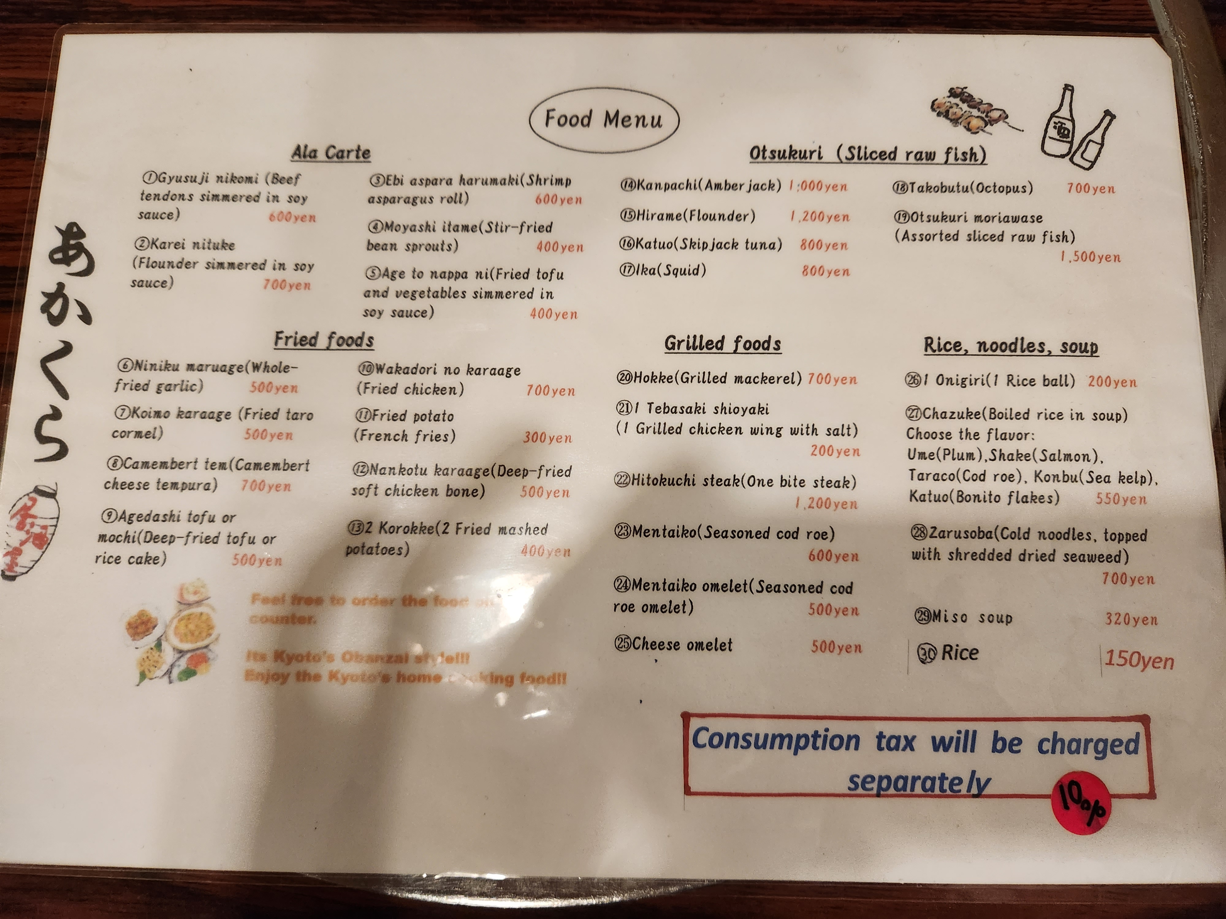 아카쿠라에는 영어메뉴판이 있어서 주문하기 쉽다.