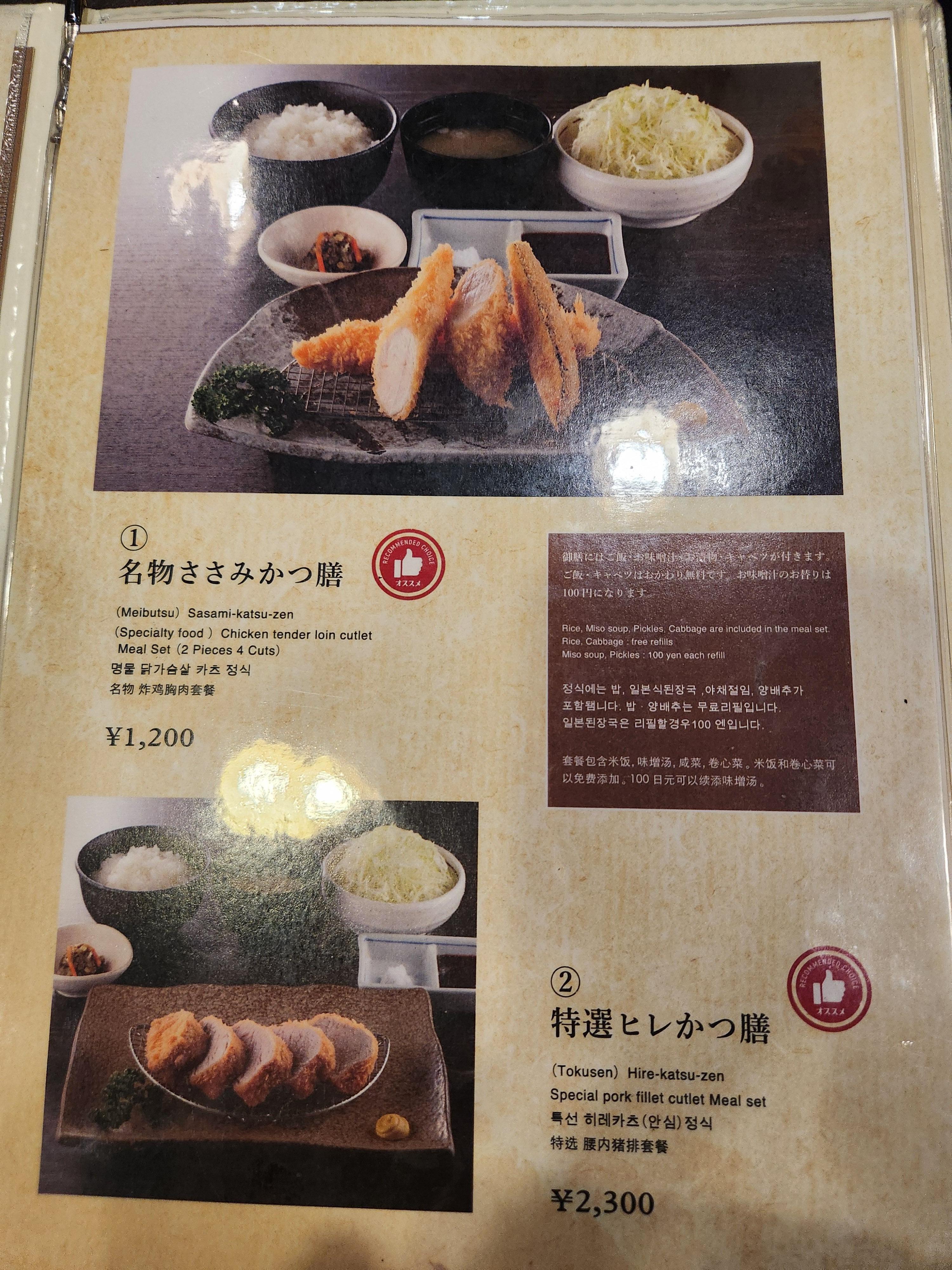 메뉴는 닭안심카츠가 1200엔이고 돈까쓰류는 2천엔대이다.