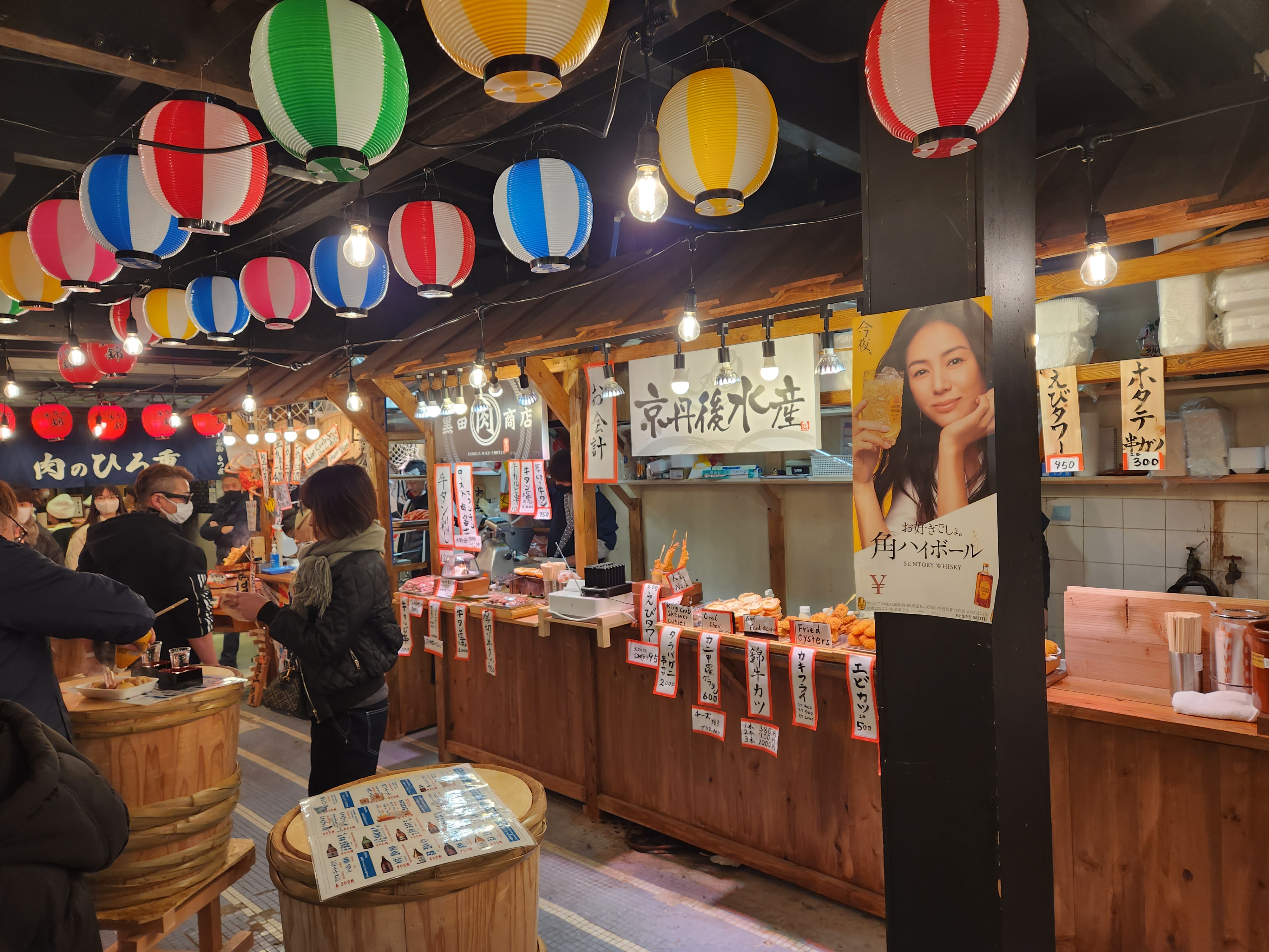 니시키시장에서 가장 좋았던 것은 야타이무라 포장마차촌(錦屋台村, Yatai mura STALL VILLAGE) 에서 마음에드는 안주 하나씩 사서 사케 잔술 또는 맥주와 함께 먹을 수 있었다는 것 이다.