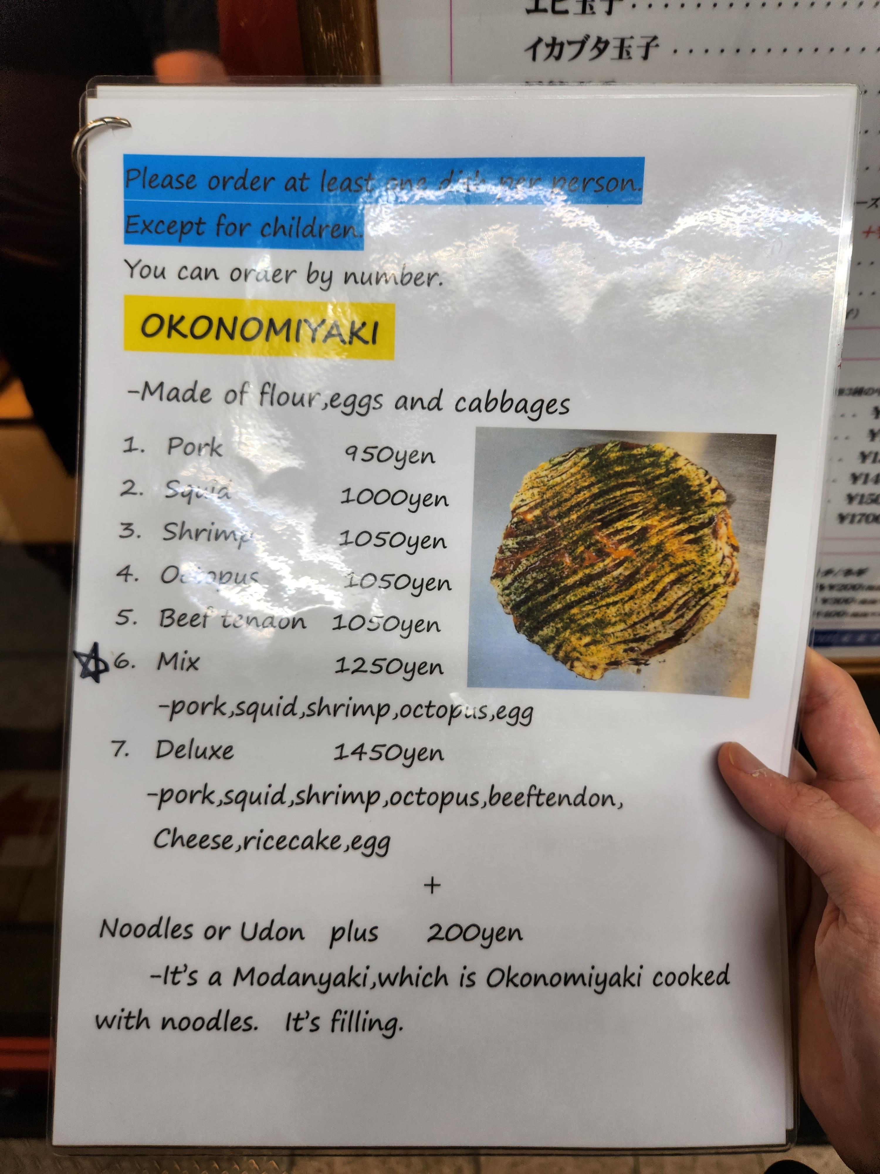 가격은 무난하게 1000엔정도이고 추천메뉴는 6번 믹스오코노미야끼, 21번 돼지계란 야끼소바다.