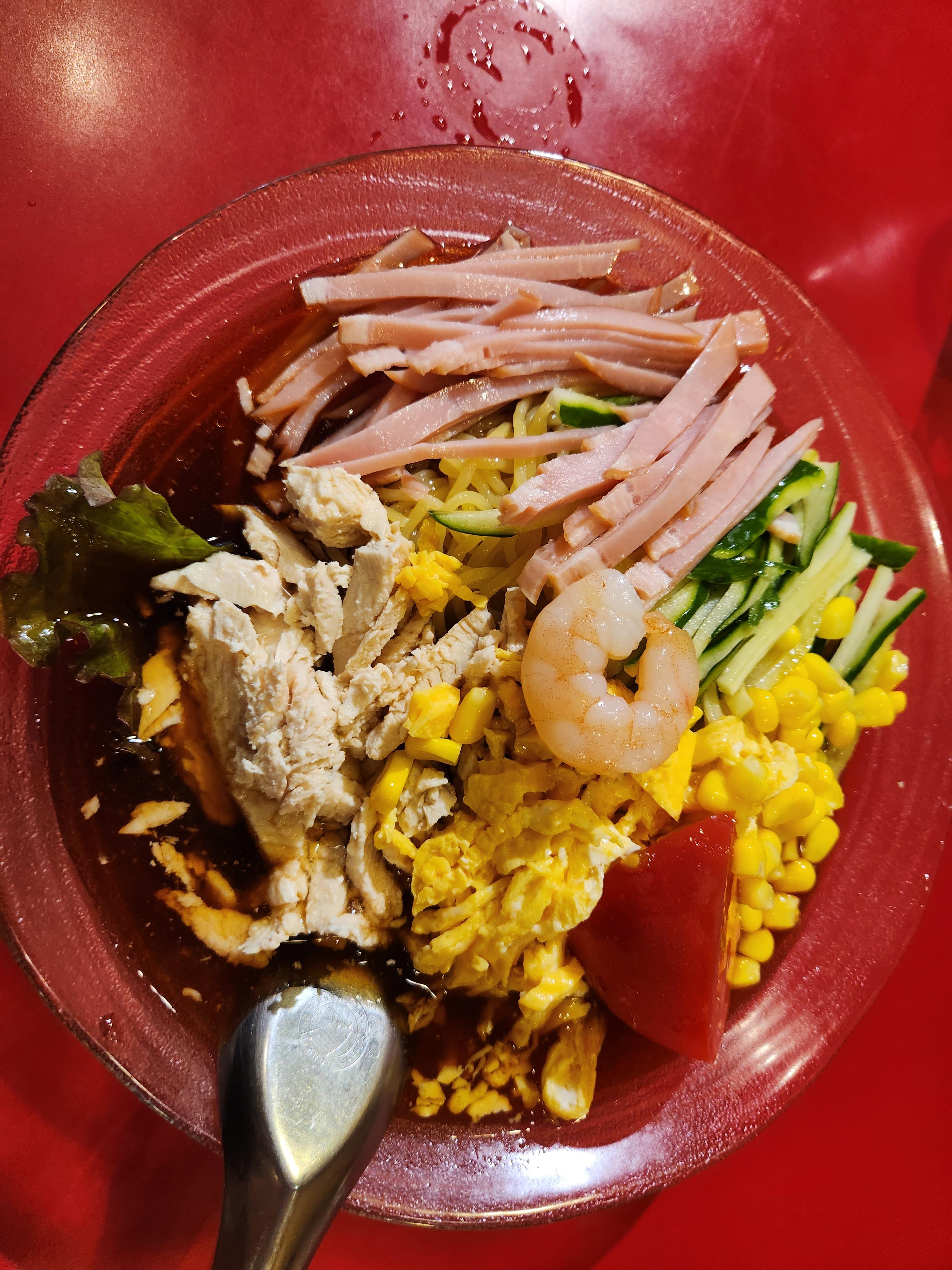한국 중국냉면과의 차이는 땅콩소스가 없다는 것, 그리고 국물이 적고 더 시큼하며 옥수수랑 토마토가 들어가는 점이다.