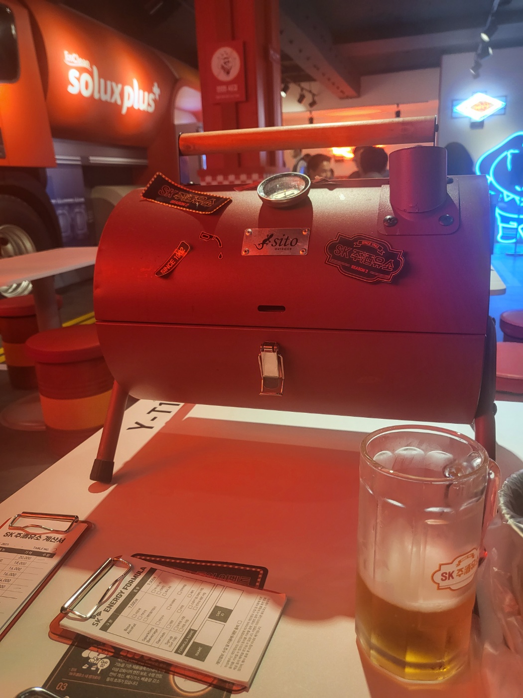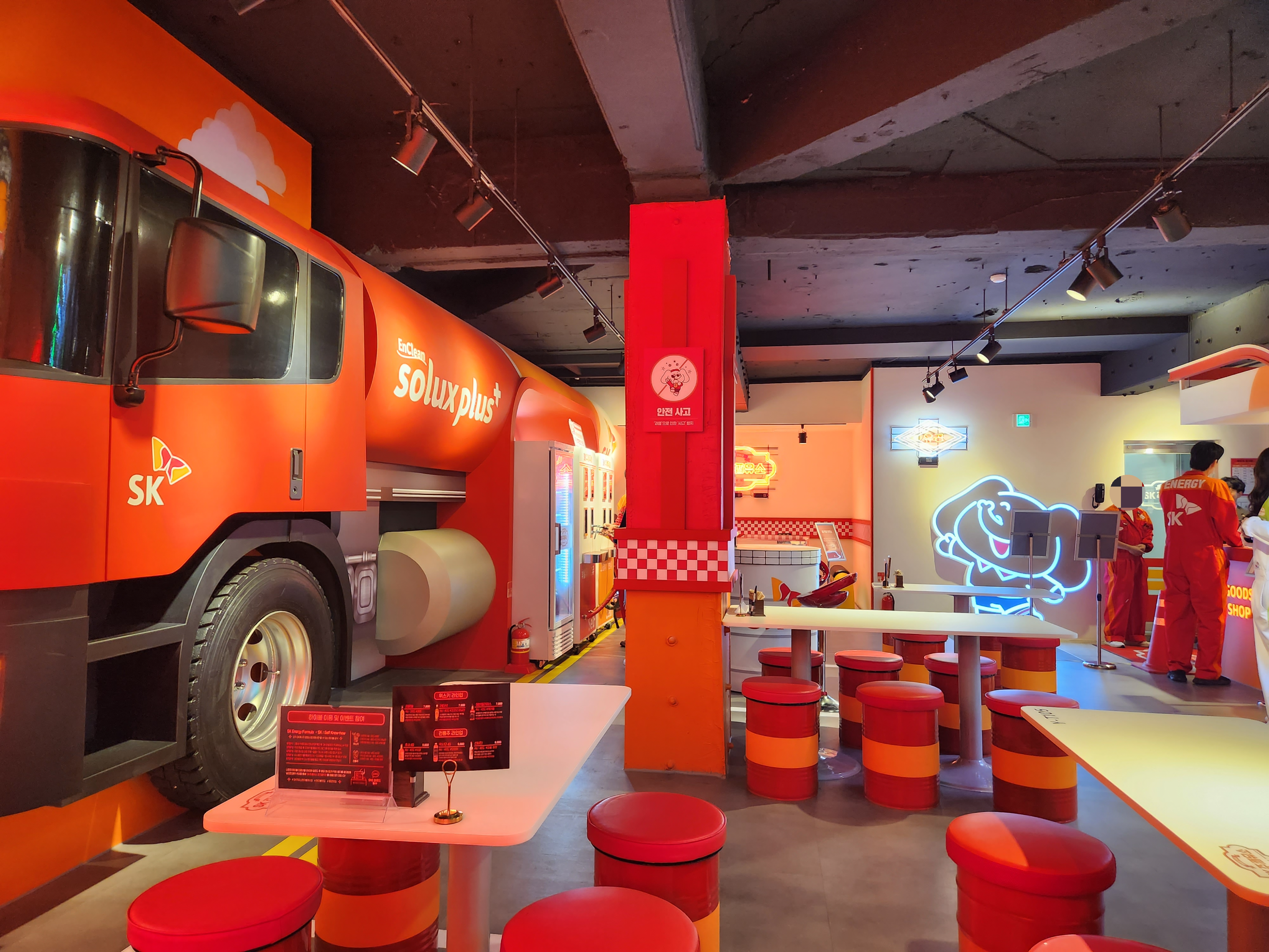 내부를 주유소처럼 잘 꾸며놨고 온통 주황 빨강색이다.