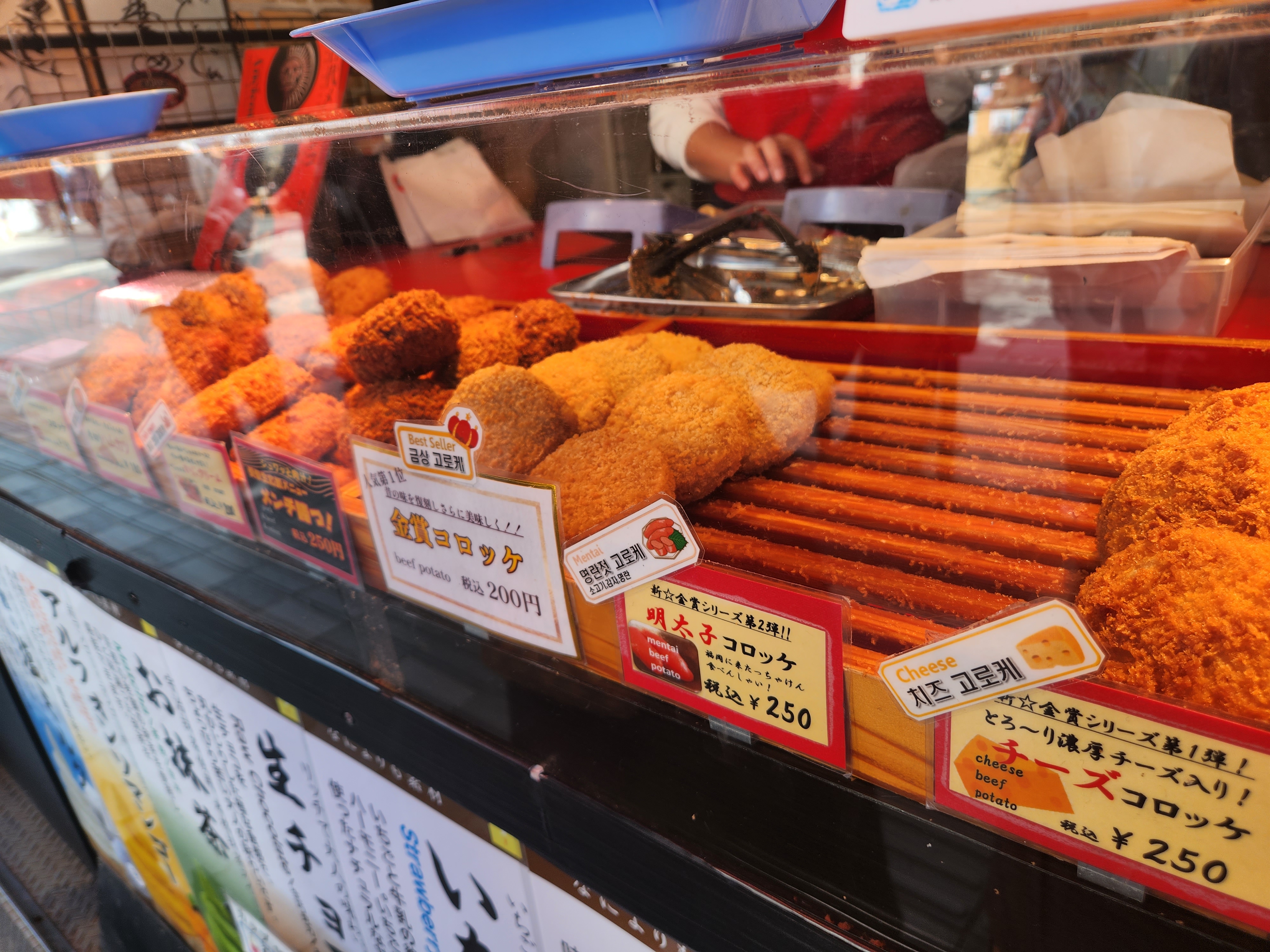 고로케를 파는곳이 있는데 치즈고로케, 명란고로케 등등 여러가지 종류의 고로케를 판다.