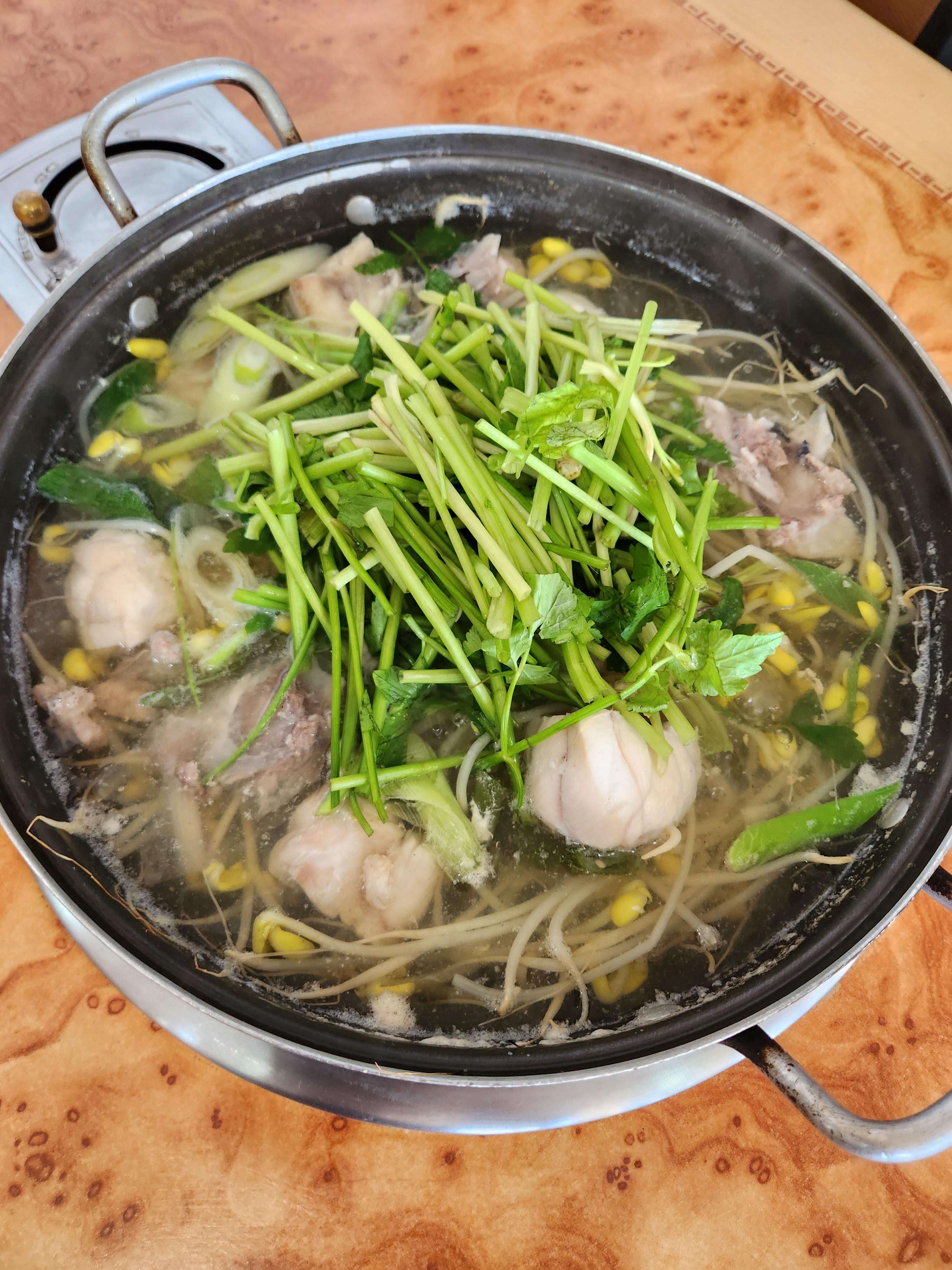 복지리는 콩나물과 미나리가 많이 시원하고 향긋했으며 국물은 깔끔하고 시원했다.